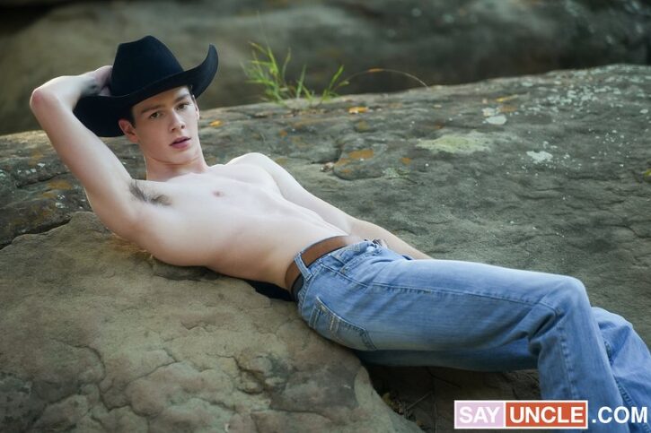 SAY UNCLE: At dawn, Texas Twink, a lonesome hitchhiker cowboy, wakes up inside his tent after a night in the mountains. Stepping out into the morning sun wearing nothing but his tight underwear, he stretches and begins his day with a peaceful moment of contemplation.